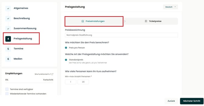 In diesem Schritt kannst Du Deine Preisgestaltung anlegen.