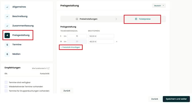 Falls Du keine Staffelpreise anbietest, bleibt es bei einer Preisstufe mit dem entsprechenden Preis pro Person.