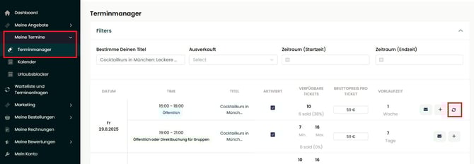 - Suche den betroffenen Kurstermin und klicke auf das Pfeil-Symbol 🔁