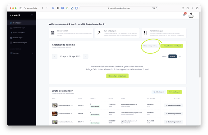 - Klicke auf „icalendar exportieren“ → eine URL wird automatisch in die Zwischenablage kopiert