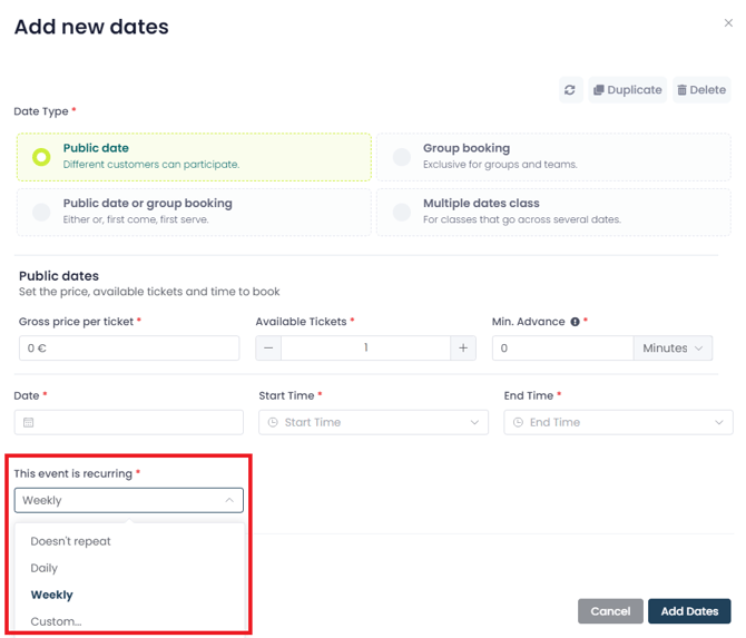 ❗ When you add a new date, the default setting initially determines that the date is recurring on a weekly basis. You can adjust this as required under “This event is recurring”.