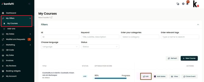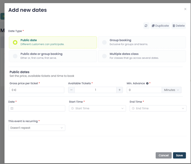 To manage your dates, you first have to create a course. You can add dates via the date manager or the course editor. đź’ˇ