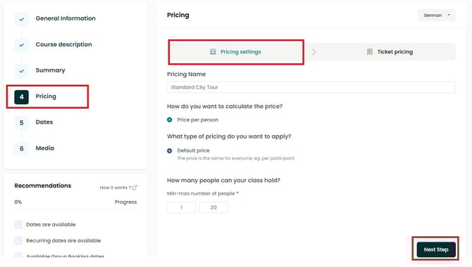 Create a new pricing model (e.g. Standard City Tour) and define how many participants can take part in your event.