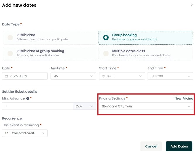 When you add new event dates, you can simply select your pricing model from the dropdown menu.