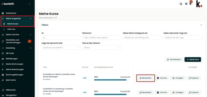 - Gehe auf „Meine Angebote → Meine Kurse“ in Deinem Partnerbereich.