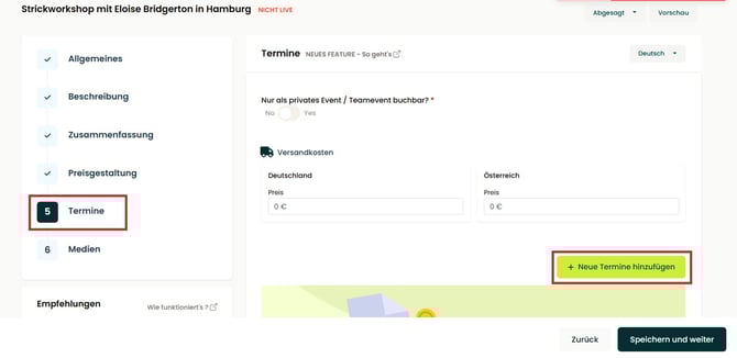 - Klicke auf „Neue Termine hinzufügen“ und anschließend auf „Speichern und weiter“, wenn Du alle Termine hinzugefügt hast, um die Termine zu speichern und auf Deiner Kursseite zu veröffentlichen.