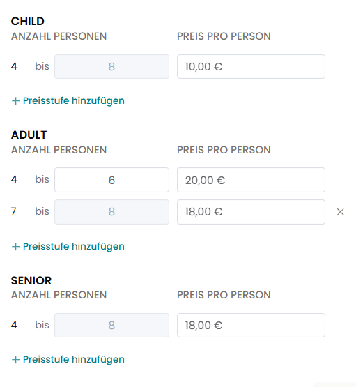 ❗Bitte beachte, dass alle bisherigen Preiseinstellungen gelöscht werden, wenn Du von Standardpreis zu Kategoriepreis wechselst! - Wähle „Kategoriepreis“ und füge Deine Ticket-Kategorien inkl. Altersspanne hinzu. Zur Auswahl stehen: Kind, Student, Erwachsener, Senior.