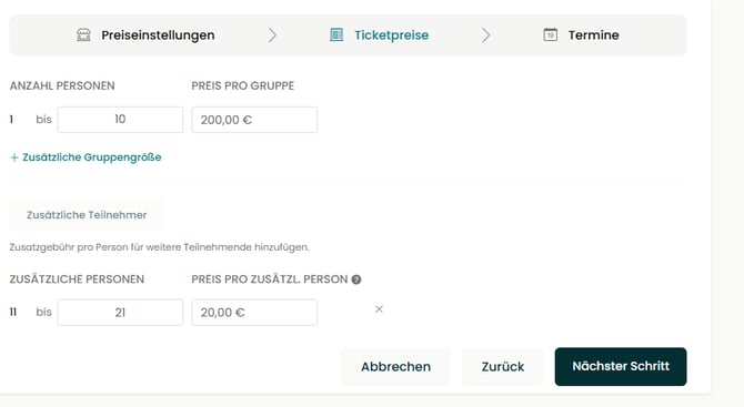 - Im zweiten Schritt (Ticketpreise) legst Du nun Deinen Pauschalpreis für die Basis-Gruppe fest (z.B. 1 bis 10 Personen für 200 €).